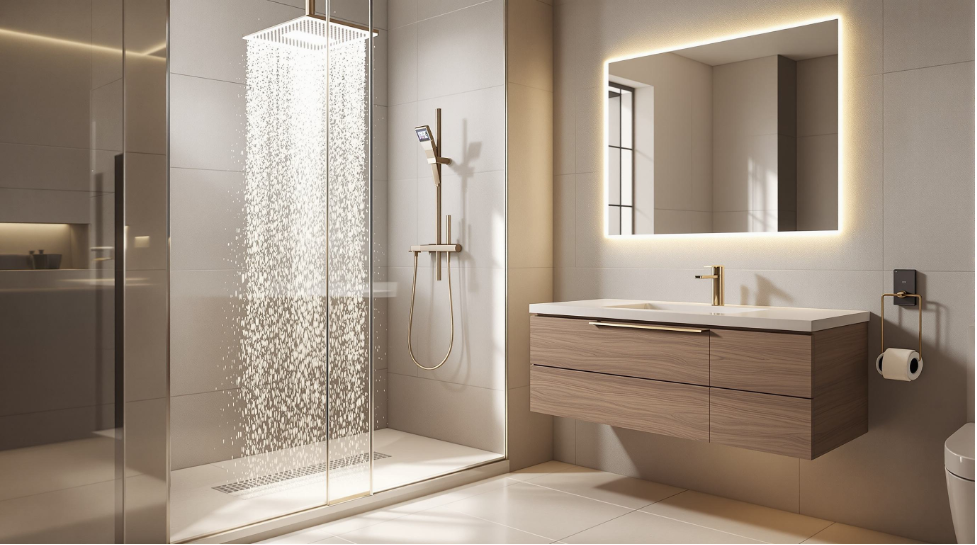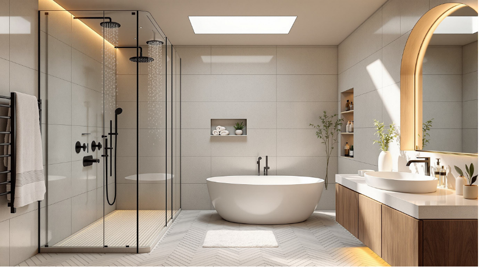 Fixtures matter more than most people think. A rainfall head and a handheld wand together cover just about every need. Thermostatic valves are worth it too. You set the temperature once and it's the same every morning. No more cold starts.