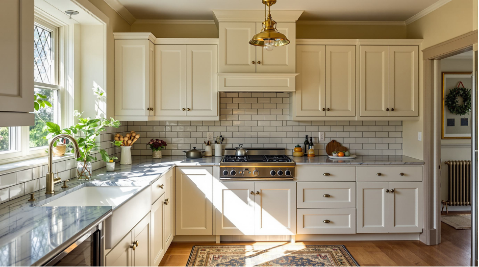 Cabinet door style does a lot of the work here. A shaker door in warm white or soft sage looks current without being trendy. Hardware matters too. Brushed brass or matte black gives a modern feel without fighting the home's original character.